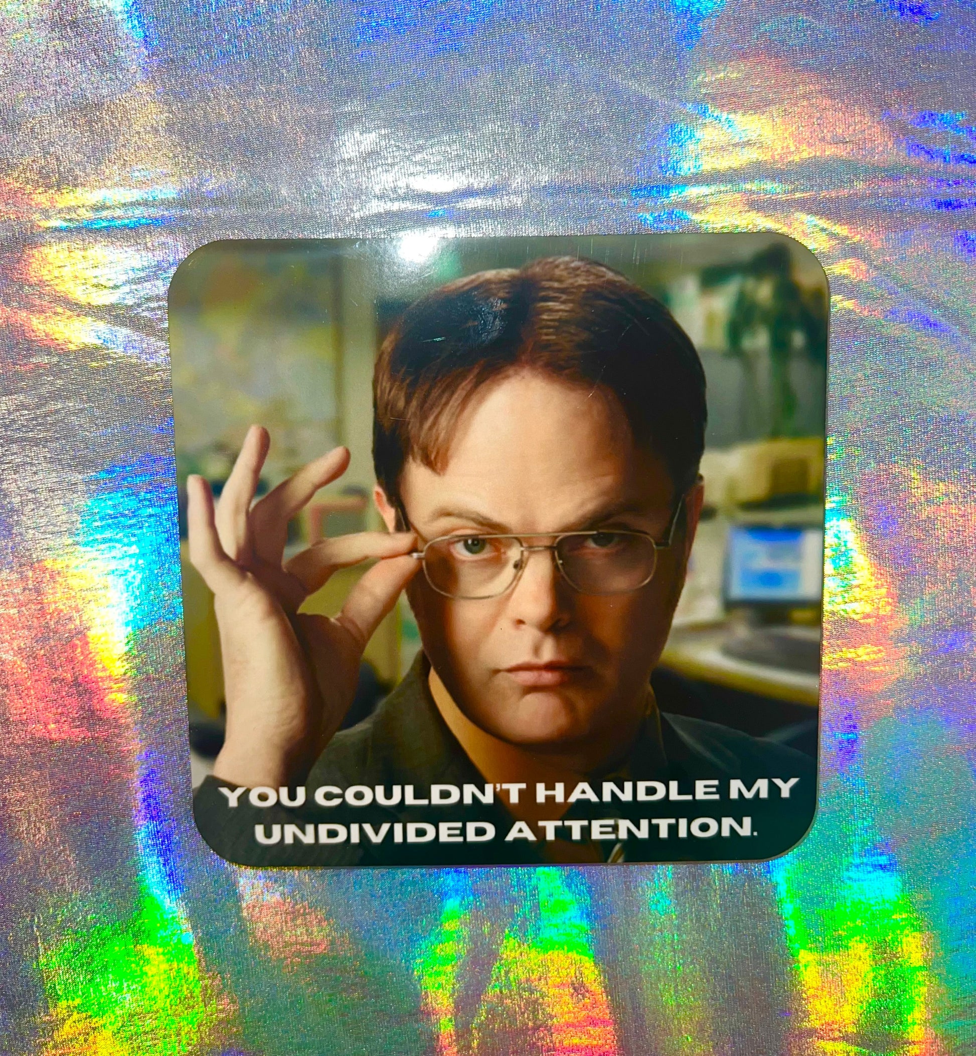 Add a dash of wit and charm to your space with this "You Couldn't Handle My Undivided Attention" cork-backed coaster, inspired by The Office. Perfect for fans of the legendary Dwight Schrute, this coaster is both a functional and hilarious tribute to one of television's most iconic characters.